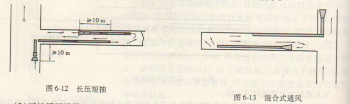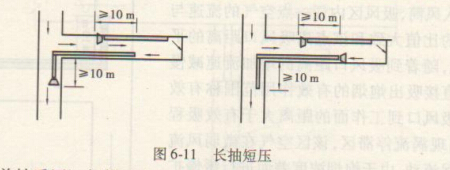 1.長抽短壓(前壓后抽):工作面的污風由壓入式風筒壓入的新風予以沖淡和稀釋,由抽出式主風筒排出.如圖6-11所示。